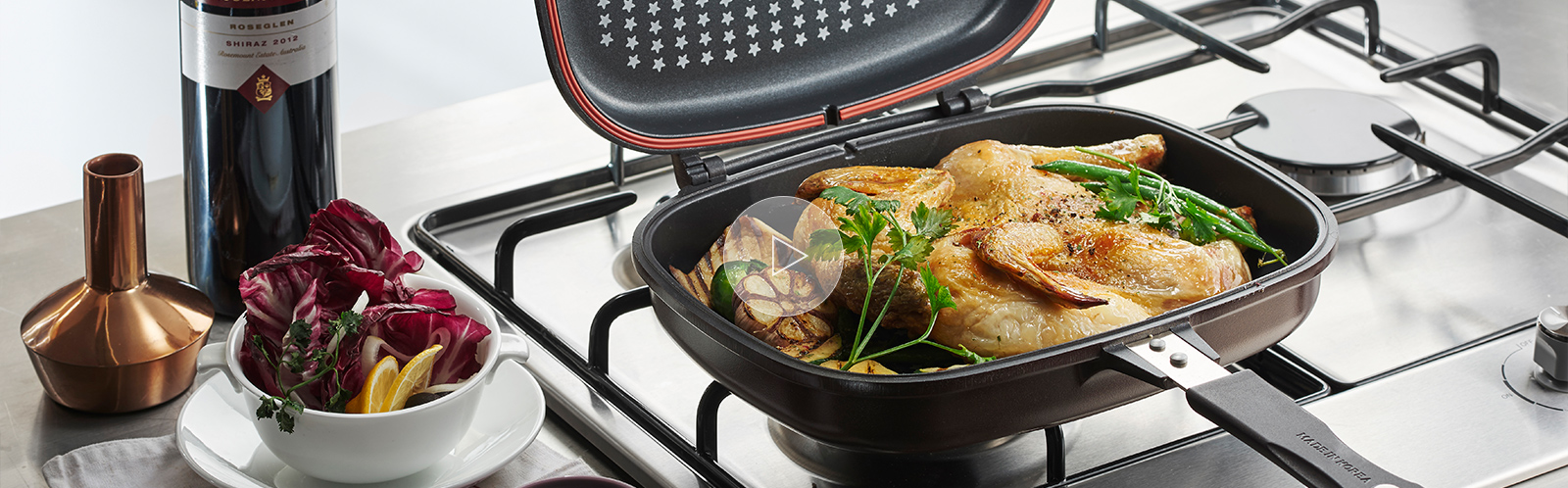 Rewolucyjny zatrzask umożliwia proste i wygodne otwieranie i zamykanie patelni. Duża siła magnesu zapewnia pewne zamknięcie oraz prowadzi do zwiększenia ciśnienia wewnątrz patelni.